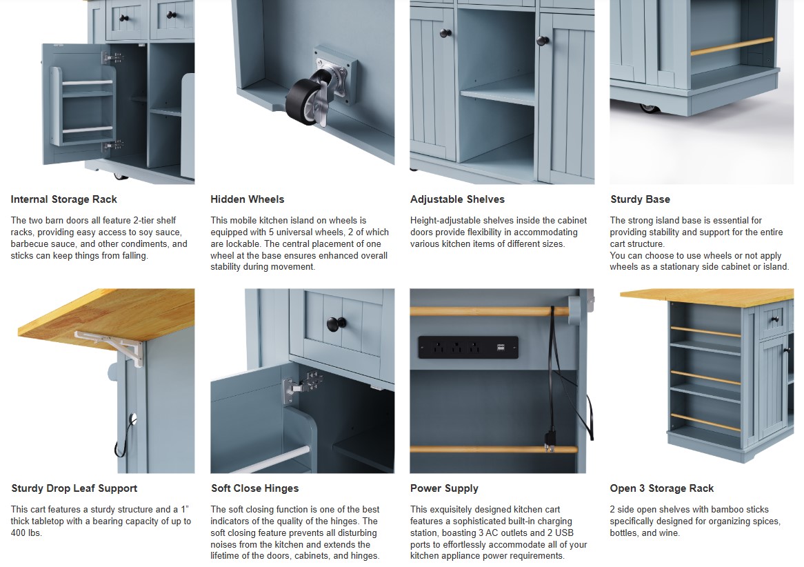 | Summary | The kitchen island fuses classic style, high-end details, and versatile storage. Crafted from CARB Phase II certified MDF boards, its 50”-wide countertop features a smooth, scratch-proof laminate finish table that’s great for food prep. The island includes an abundance of storage options: Two cabinets contain a 2-tier door interior storage rack for spice and jars, while 2 side open shelves with bamboo sticks specifically designed for organizing spices, bottles, and wine. Power outlets and towel racks on the same side add another level of functionality. |