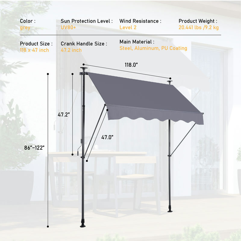 - Easy Adjustment: The retractable awning support poles can be adjusted in height from 86″ to 122″ to fit various door and window heights. Simply turn the crank handle to adjust the awning’s angle from 0° to 90° for versatile shading options. It’s easy to extend and retract as needed.