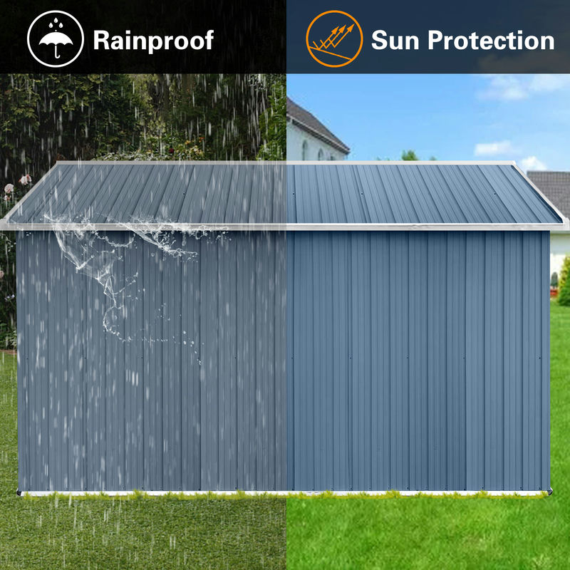 Features: [Practical Garden Storage Solution] Featuring a pent roof, this 10ft x 12ft storage shed provides impressive storage room for garden tools, equipment, and materials. [Punched Vents] Unlike typical sheds with plastic vents, this shed comes with two integrated punched vents which will not deteriorate against sunlight. [Robust Construction] Nothing irks a garden hobbyist more than the sight of a collapsed shed. Luckily, this shed utilizes sui generis aluminum frames which greatly increase the overall sturdiness. On top of that, the galvanized steel panels, coated with eco-friendly painting, can endure harsh weather for at least 10 years. [Hinged Door and Padlock] A hinged door offers more customization opportunities than a sliding door does. A heavy-duty complimentary padlock grants extra safety. [Easy to assemble] The uniquely designed aluminum frames provide not only extra sturdiness but also a smooth assembly process. No experience is needed to finish the shed.